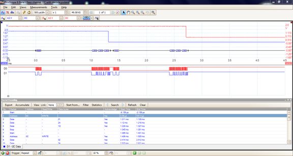下图展示的就是PicoScope的软件界面,分成了三个区域:最上面的一个显示两个模拟信号A和B,以及I2C总线的概貌。中间的一块显示两个数字通道D0和D1的波形,最下面一个则是I2C解码的结果表格。
